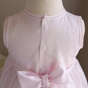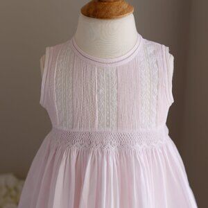 This Pink Girl's Dress in size 3T is as Lovely as it gets! The sleeveless style is perfect for warm weather. The neckline has double piping trim that is hand-faggoted together with white stitching. The arm opening mimic the neckline with double piping with hand faggoted stitching. The entire front of the bodice has tiny hand stitched vertical pin tucks. Three vertical rows of delicate fluted French lace are bordered on both sides with white floral embroidered vines. Just above the gathers of the skirt is a section of lattice style smocking. A zig-zag border sits just at the gathers of the skirt, bordering the smocking. Upper button back closure and a wide matching tie-back sash allows for the perfect fit. Brand New without tags. This particular style is a RARE Find- no longer in production