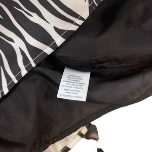 The Pink & Violet Big Girls Mock-Neck Zebra-Print Dress is a stylish fit-and-flare dress featuring a mock turtleneck and a zebra-print skirt. It includes a sparkle waistband and a lined interior for added comfort. The dress is designed with pull-on styling and button closures at the keyhole back.