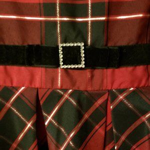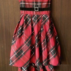 Red, Black and Silver Plaid holiday dress with velvet front trim with faux buckle. Back hidden zipper with ribbon tie and an underskirt. High Low style dress.