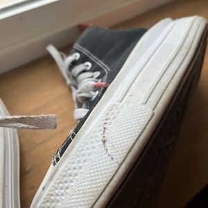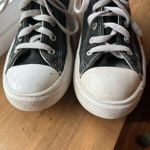 Girls platform high top black white and pink converse . Well loved . Lots of life left . In good condition with visible scuffs.
