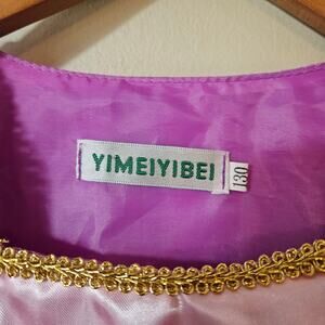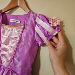 Girl's dress up pinkish-purple princess costume, size 130 (US 6/7), from Yimeiyibel. This beautiful dress has a full skirt, glittery tulle overlay, puffy sleeves, and a corset style bodice. Pull the dress over and close it with a hidden side zipper.