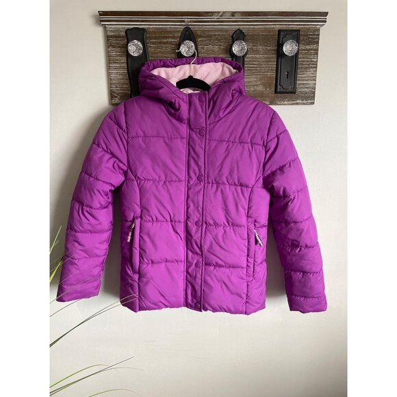 This puffer coat from provides warmth and style for girls. Constructed with a 100% polyester shell and filling, it features a hood and robust design, making it suitable for cold weather. The vibrant purple color adds a pop of color to any outfit.