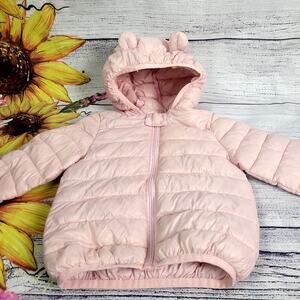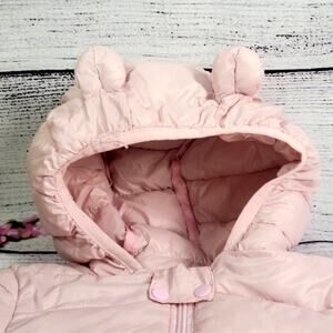 Pink puffer coat with ears on hood