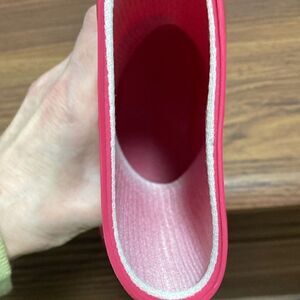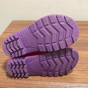 Girls pull on rain boots in Barbie pink with purple outsole. Waterproof with soft lining. Slip on design. Non marking rubber outsole.