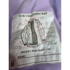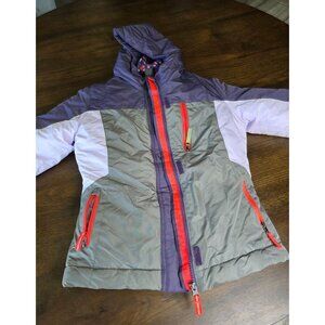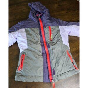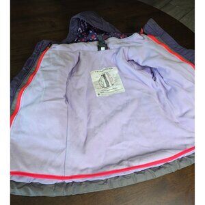 Girls Purple & Gray Hooded Winter Jacket With Polka Dot Lining Red Zippers & Fle