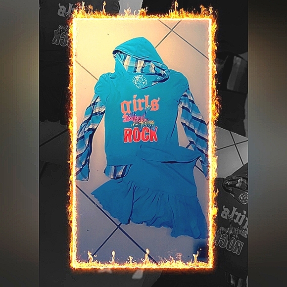 An outfit purchased on poshmart, top is layer look hoody, with plaid dress shirt coming out from under tee shirt material top, rhinestone mirror studs, and buttons on sleeves that allow them to be rolled up and held in place, and the bottom is a skort, or a skirt with attached shorts underneath. top is children's place and bottom is circo. size 14 girls.