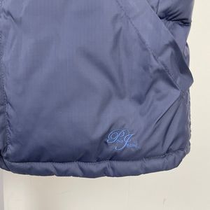 Girls Ralph Lauren Polo Jeans navy blue and pink reversible puffer vest. Size XL. 100% nylon. Filling is 60% down, 40% waterfowl feathers. Snap closure. Pockets. Great condition - just one spot in the pink side, as pictured. Measurements: 21" armpit to armpit. 23" length