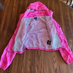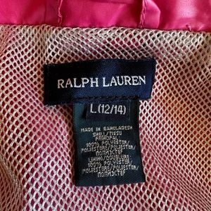 Girls kids Ralph Lauren Spring Jacket with hood in size L(12/14). Exterior is bubblegum pink with front zip and 2 front slit pockets and 2 snap buttons on hood closure.