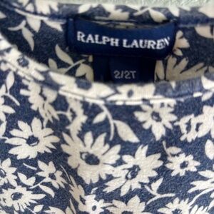 Ralph Lauren Navy and white ruffled floral tee size 2T. In good condition, minor wash wear. Pattern and ruffles are so cute on, has stretch.