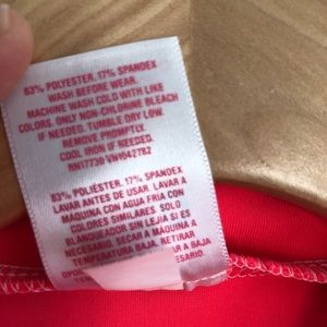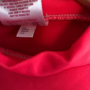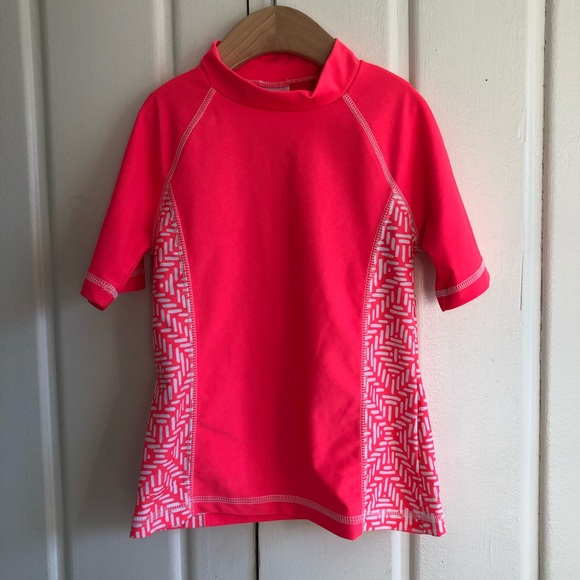 Cute rash guard is has cute design on the sides. In very good used condition. Color is more of a coral than pink.