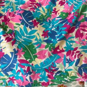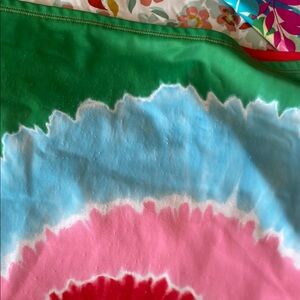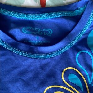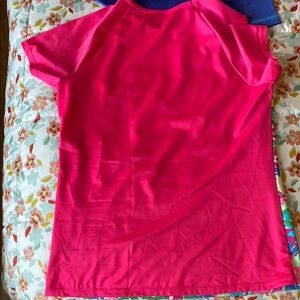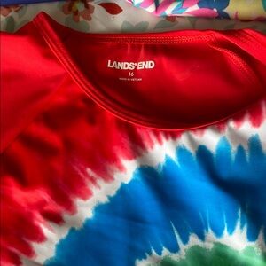 Set of three vibrant short sleeve rash guards. Includes blue with floral design( Crazy Shirt brand, Women’s size small but fits like Girls size XL, pink with multicolor pattern, and red with tie-dye swirl ( both Girls size 16 XL Lands End )Great condition, minor picks on tie dye front, see pictures.