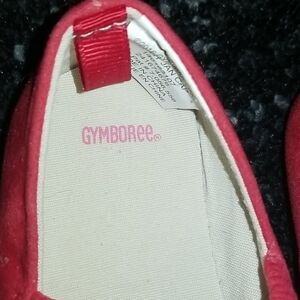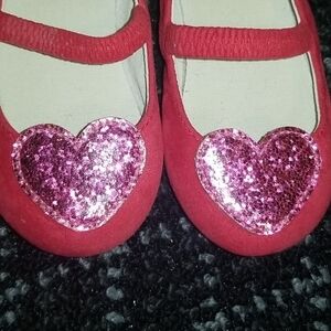 Tap 3 times to get back to Kansas. These red elastic slip ons are cute n comfy. Glittery hearts make that "girly" statement. Worn once inside.