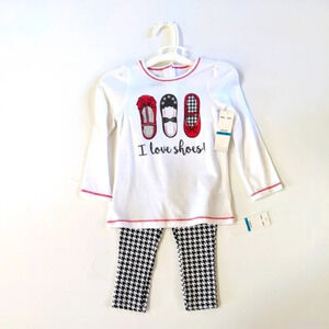 Kids Headquarters Girls 24M 3pc red, 4 heart shape black button jacket, gathered at waist with white long sleeve “I love shoes” pic & slogan shirt and hounds tooth pattern leggings. Jacket & Shirt 60% Cotton/40% Polyester; Leggings 57% Cotton/38% Polyester/5% Spandex. New w/tags.