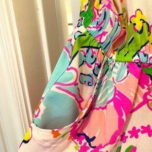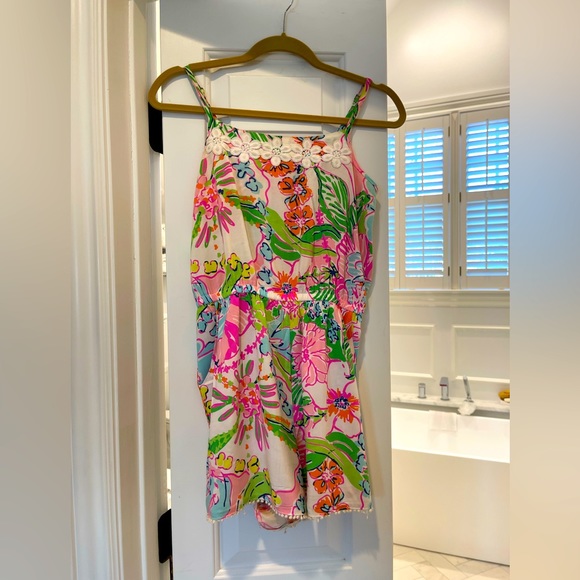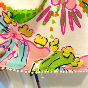 Lilly Pulitzer Target, colorful print, adjustable straps. Tiny Pom Pom fringe around legs shows a bit of wear, otherwise excellent condition.