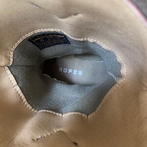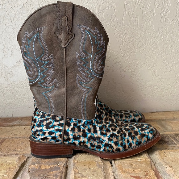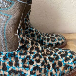 Faux leather, 9” shaft, Square toe, Fabric lining, Cushioned footbed, Shaft embroidery, Leopard print with glitter inlay, TPR outsole, Stockman heel. Excellent condition.