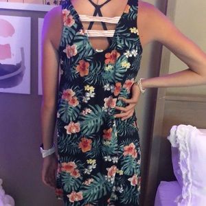 A green tropical print roxy dress that can be used as a swim suit coverup along with being formal enough to wear to dinner.