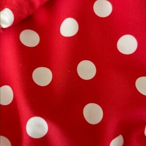 Allover red and white polka dot print with black trim and ruffles