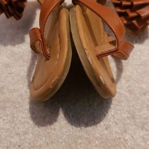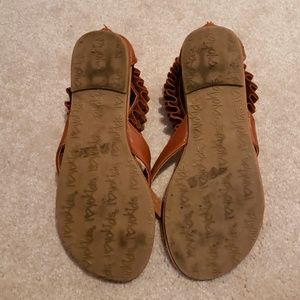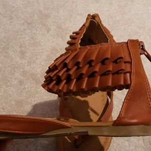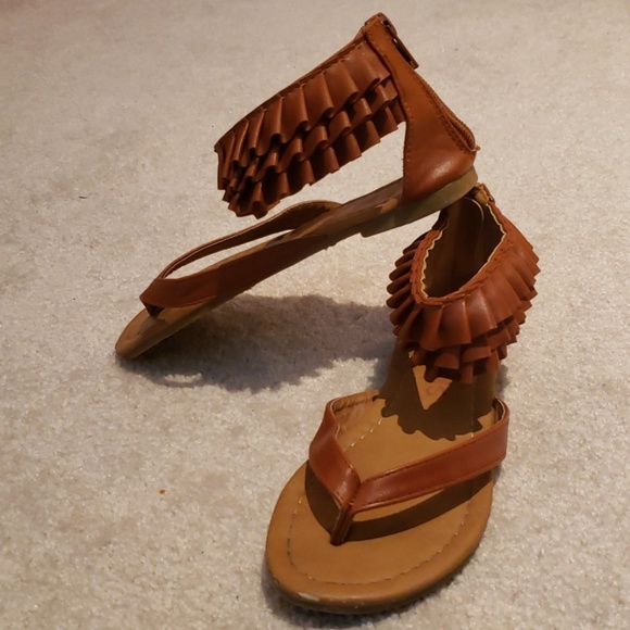 Brown faux leather, ruffle Sandals. Zip at heel. A few small scuffs at the toes. Gently worn and adorable on!