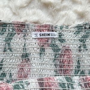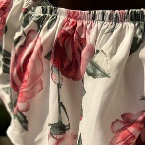 Roses on white fabric is shirred into a tube top with a neckline of the same fabric covering your shoulders.