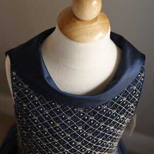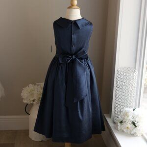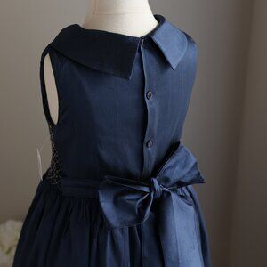 This Girl's 100% Silk Dress by Luli & Me is GORGEOUS! Done in a beautiful, Navy hue Dupioni silk (with natural random texture- a characteristic of Dupioni.) The sheen on this dress is amazing (photos don't capture it)! The entire bodice is smocked in a lattice design with beautiful embroidered metallic threading with floral accents and seed beads. The Metallic threading is woven within the embroidery and smocking giving this dress a look fit for royalty! The unique neckline is a rounded cowl neckline that extends from shoulder to shoulder. The back of the collar finishes off in a point style. Upper button back closure with a matching silk sash that ties into a big, billowy bow for a perfect fit. Dress is lined and has a ruffle of fine crinoline added to the liner for just the right amount of volume. Perfect for Flower Girls, recitals, Daddy/Daughter dances or any Special Occasion. See measurements below for fit. Worn once briefly for formal portrait. Beautiful, Like New condition!! Fit for a Princess! Stunning, Unique Dress!!