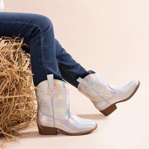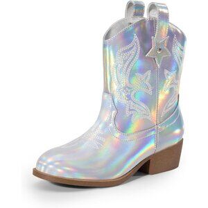 ⚡Girls Silver Cowgirl Boots With Low Heel Western Embroidered Fashion Mid Calf