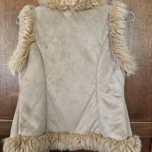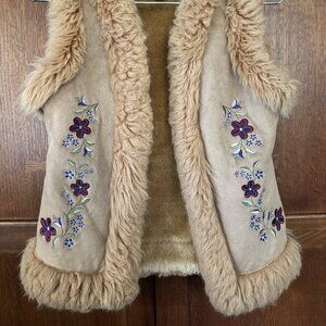 Your little lady will love this stylish winter vest from the Limited Too My Scene. The shell has the look and feel of tan suede. The design is machine embordered burgundy flowers and smaller purple flowers with green and beige leaves. The lining and vest boarder is thick faux fur. The front closes with eye and hook closures. It's made of polyester and acrylic. The length is 20" Girls size 10,