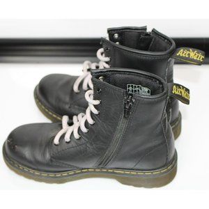 Stylish black Dr. Martens combat boots for girls in size 4. These tie-up boots are perfect for adding an edge to any outfit while offering comfort and durability.