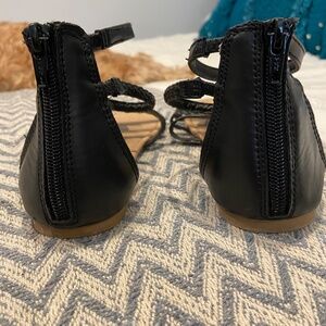 Gently used SO brand Priscila gladiator sandals in girls size 4. These stylish black sandals feature a zip-up back for easy on and off, comfortable memory foam insoles, and eye-catching starburst jewel embellishments across the straps. Made from manmade materials and perfect for dressing up any outfit. Great for spring and summer occasions — cute, comfy, and in great condition!