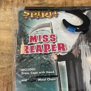Get ready to spook everyone at the Halloween party with this Girls Size Medium 12-14 Miss Reaper Tween Halloween Costume Dress Cape Chain! Made with polyester, this dress in black is perfect for Halloween, featuring a spooky reaper theme that’s sure to turn heads. The costume fits tween sizes and comes with a cape, chain, and dress to complete the look.