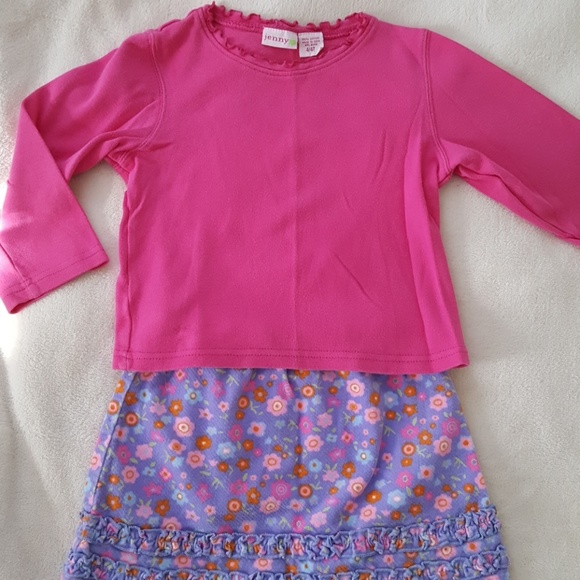 Cute outfit includes long sleeve pink tee and a floral skirt. The skirt is lavender with a pink floral pattern, in a soft velour. There are ruffles on the skirt and the neckline of the shirt. Girls size 4T in good condition.
