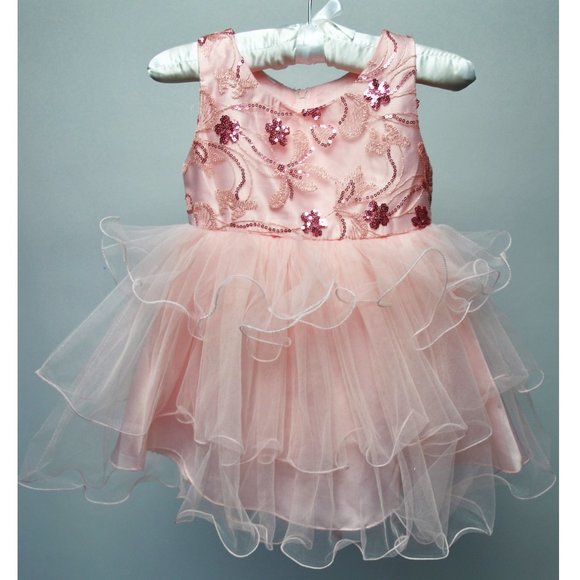 Girls Small Light Pink Tulle Tea Length Dress with Sequin Floral Print Bodice