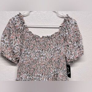 She can have classic flair to her everyday looks with this Smocked Short-Sleeve Dress from art class . This girls' knee-length dress features a smocked front along with a pleated design below the waist for a flared look. The square neckline is adorned with ruffle detailing while the short sleeves are accented with cinches for a perfect fit. Color: light blue with peach, green floral print. Has stretch