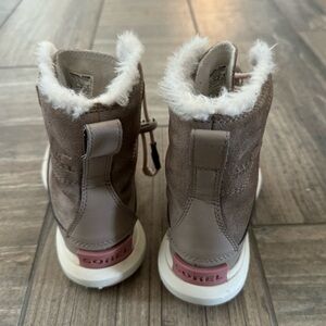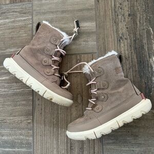 Girls Sorel Explorer Next Joan Waterproof Boot size 1. Used with wear as seen in photos. UPPER: waterproof suede Microfleece lining. Waterproof bootie construction. Laces are not waterproof.