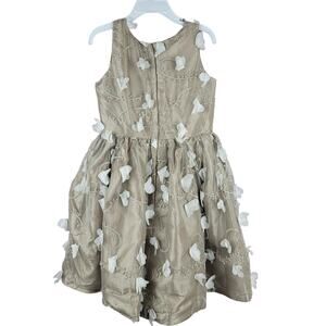 Stunning girls special occasion dress with a tulle outer layer, metallic thread accent embroidery and three dimensional tulle flowers all over that almost look like butterflies fluttering all around. The dress color is a gorgeous bronzed champagne with a satiny sheen to it. The absolute perfect special occasion dress for a flower girl, daddy daughter dance, birthday tea party, New Years Eve or any day that your little one wants to feel like a princess.