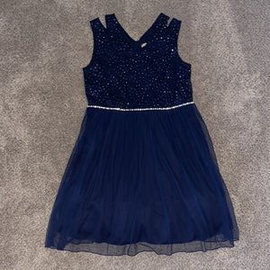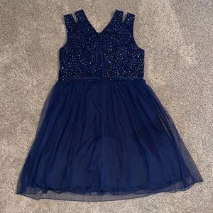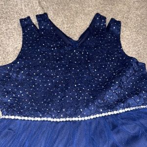 Navy blue, silver, excellent condition, lace top, tuel bottom, size girls 18.5, zippers in the back, sleeveless