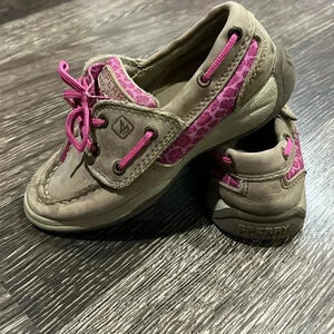 Girls Sperry shoes with pink, glitter cheetah design. Velcro closure. Size 10m