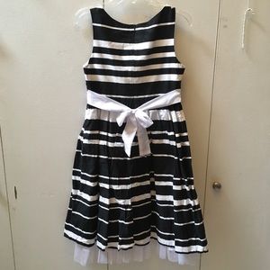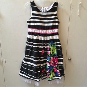 Pink, black, and white spring/summer dress with floral pattern on skirt and matching 3/4 sleeve jacket. Slightly wrinkled (mostly near the hem) but otherwise in great used condition.