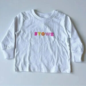 Long sleeve white tee with pink yellow & orange STOWE graphic on the front :) purchased from the Yellow Turtle in Stowe for my niece but totally forgot to send it to her & she is now too big :(