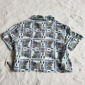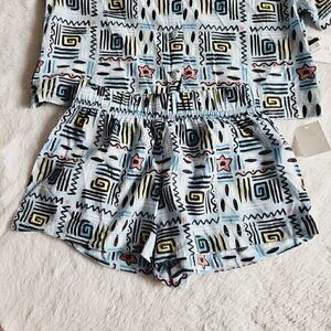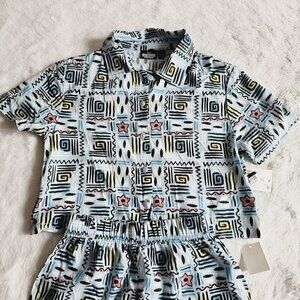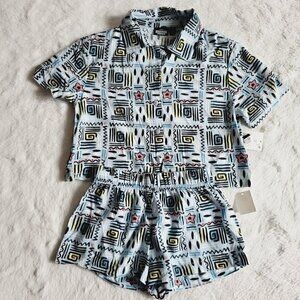 Your child will be ready for new adventures in this 2-Piece Stranger Things Woven Top & Bottom Set. Crafted from a lightweight woven fabric, both the pieces in this set offer them all-day comfort. This set includes one short-sleeve button-down shirt and coordinating shorts, both featuring allover abstract Stranger Things print in black with shades yellow, pink and blue on a light blue background for fun, coordinated flair.