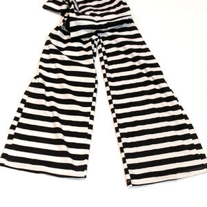 Girls' Black & White stripe, wide leg, flare bottom, Tie-Waist Knit Jumpsuit with hot bright pink neck trim and back keyhole with button-and-loop closure. Embellished with Kensiegirl "K" pink glitter heart on chest front right. 95% Polyester, 5% Spandex. New with Tags.
