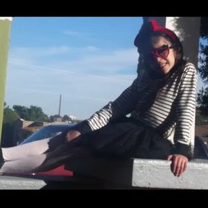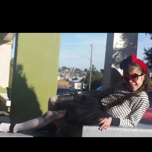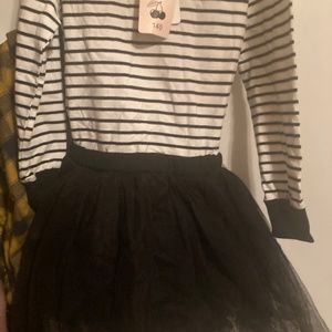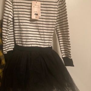 Really pretty striped dress with layers of mesh Tulle skirt. O neck ringer style black matches with black cuff at wrist.