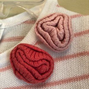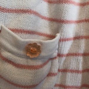White and Pink stripes with cute flower detail on the pockets. 100 % cotton, button closure at the back, Gymboree 5T size, very lightly used