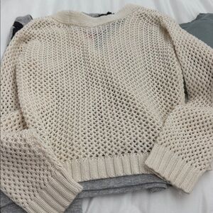 Stay cozy and stylish with this cream knit sweater, giraffe sleeves sweatshirt, and plain green sweatshirt.