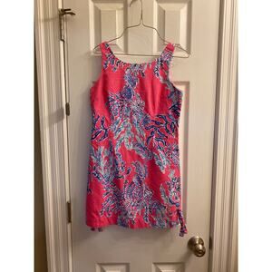 Girls Sz 14 Lilly Pulitzer Shift dress. Zips up in back with a starfish zipper. Hot pink & blue print.