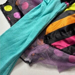 Preowned great condition. Some wear on sleeves. A black dress w. rainbow laces on the bodice, mismatched sleeves, a glittery waistband, and a tiered skirt w. colorful stripes, polka dots & pink tulle.