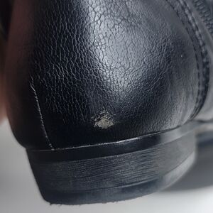 A pair of gently worn girl's faux leather boots in a size 2. They are black in color and have a strap with a buckle and a zipper. There are a few minor scuffs marks on both boots that you can find in the pics above. THESE BOOTS DO NOT HAVE INSOLES!!! Please check pics for details