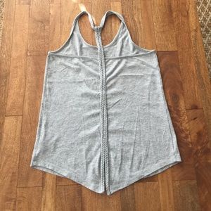 Girls grey racer back Tank. Braided detail down the back with small slit at the bottom. Good condition. 60% cotton/40% polyester.