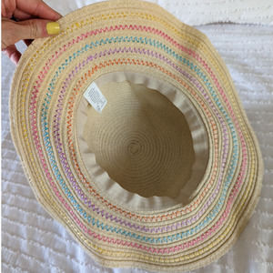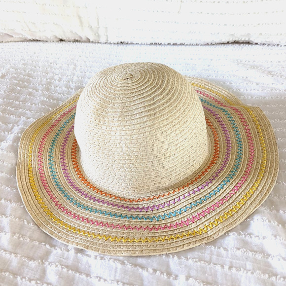 Details: Girls semi floppy sunhat from Target. Beige color with multi color zigzag lines going around the brim. Perfect hat for the beach, pool, vacation and lounging in the sun!