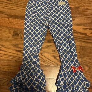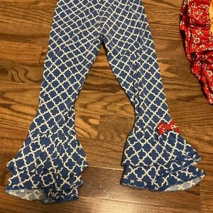 Charming kids matching set by Eleanor Rose. Features a blue patterned top and pants. Yellow skirt with playful pumpkin design and red ruffle accents. Perfect for festive occasions.