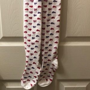 NWOT. Girls white tights with pink and purple hearts. New and never worn because the size seem to have been off. Fit more like a size 8 or 10. The inside tag say 12/14 but it’s incorrect. My daughter tried tights on after I washed them and I threw away the tags thinking they would fit.